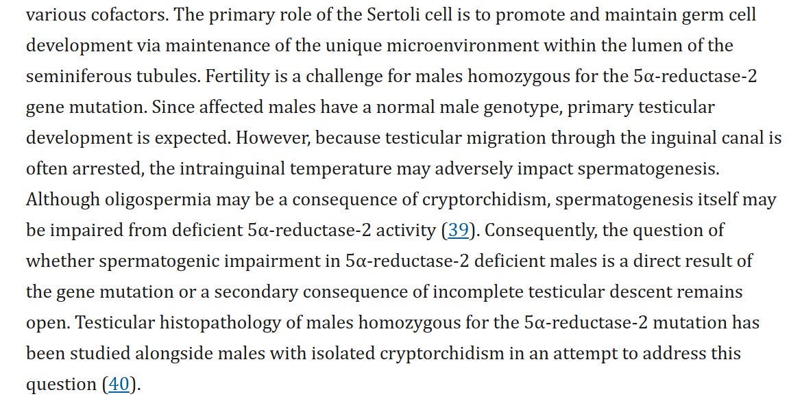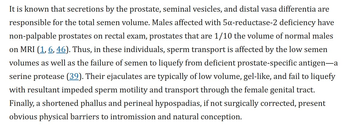 But 5-ARD profoundly impacts fertility. First, low DHT can impair the growth and differentiation of sperm cells and the growth of the prostate, causing them to have a prostate that is 1/10th the healthy size. Small prostates mean that semen volumes are low, harming sperm transport and motility. Second, undescended testes can also disrupt the careful balance of temperature for sperm creation (Kang, Imperato-McGinley, Zhu, & Rosenwaks, 2014)