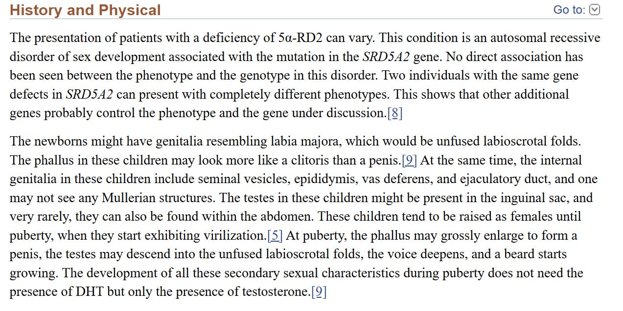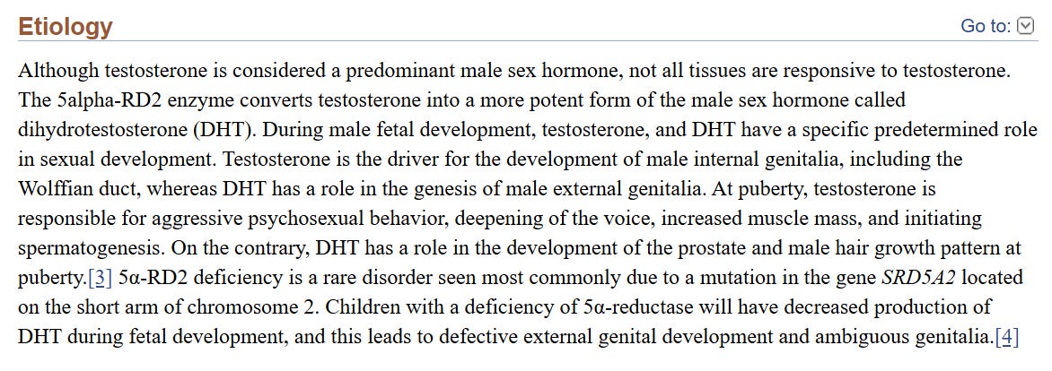 This disorder is known as 5-alpha reductase deficiency (5-ARD), common in certain parts of the world such as the Dominican Republic. But affected individuals do not begin as females. It is a MALE ONLY disorder of sex development. In the womb, affected males develop testes like normal, but cannot complete the growth of their penis and scrotum because they are unable to produce DHT due to an enzyme deficiency. DHT is a potent testosterone required for the development of the male’s penis and scrotum and descent of the testes (Kumar et al, 2022). Without it, males are born with external genitalia that is underdeveloped