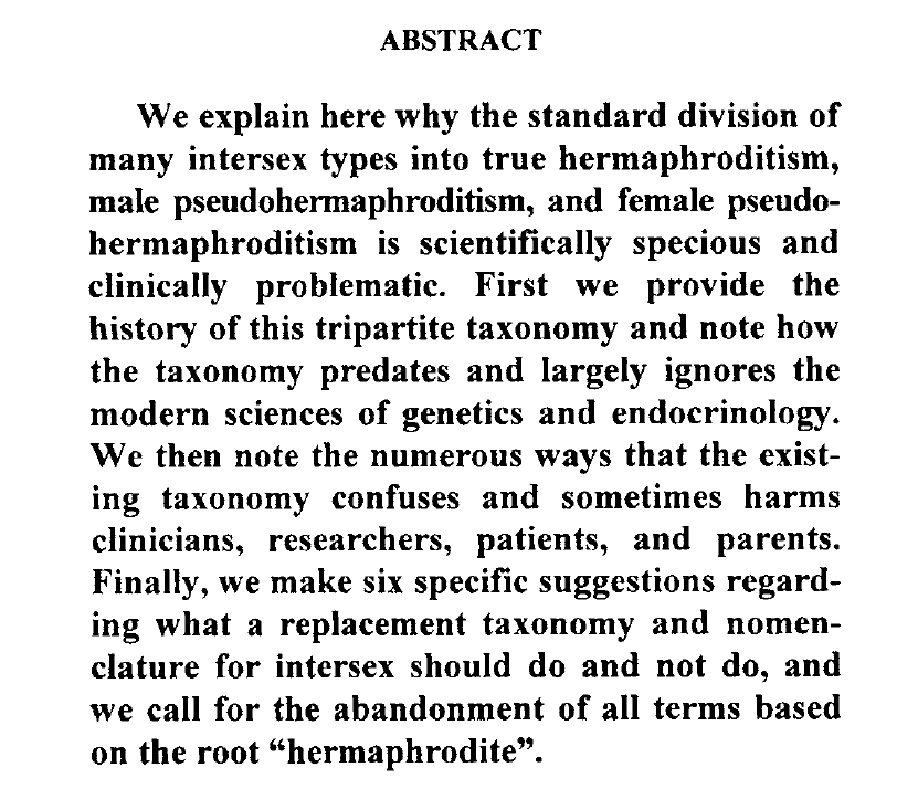 Dreger, A. D., Chase, C., Sousa, A., Gruppuso, P. A., & Frader, J. (2005). Changing the nomenclature/taxonomy for intersex: A scientific and clinical rationale. Journal of Pediatric Endocrinology and Metabolism, 18(8), 729–733.