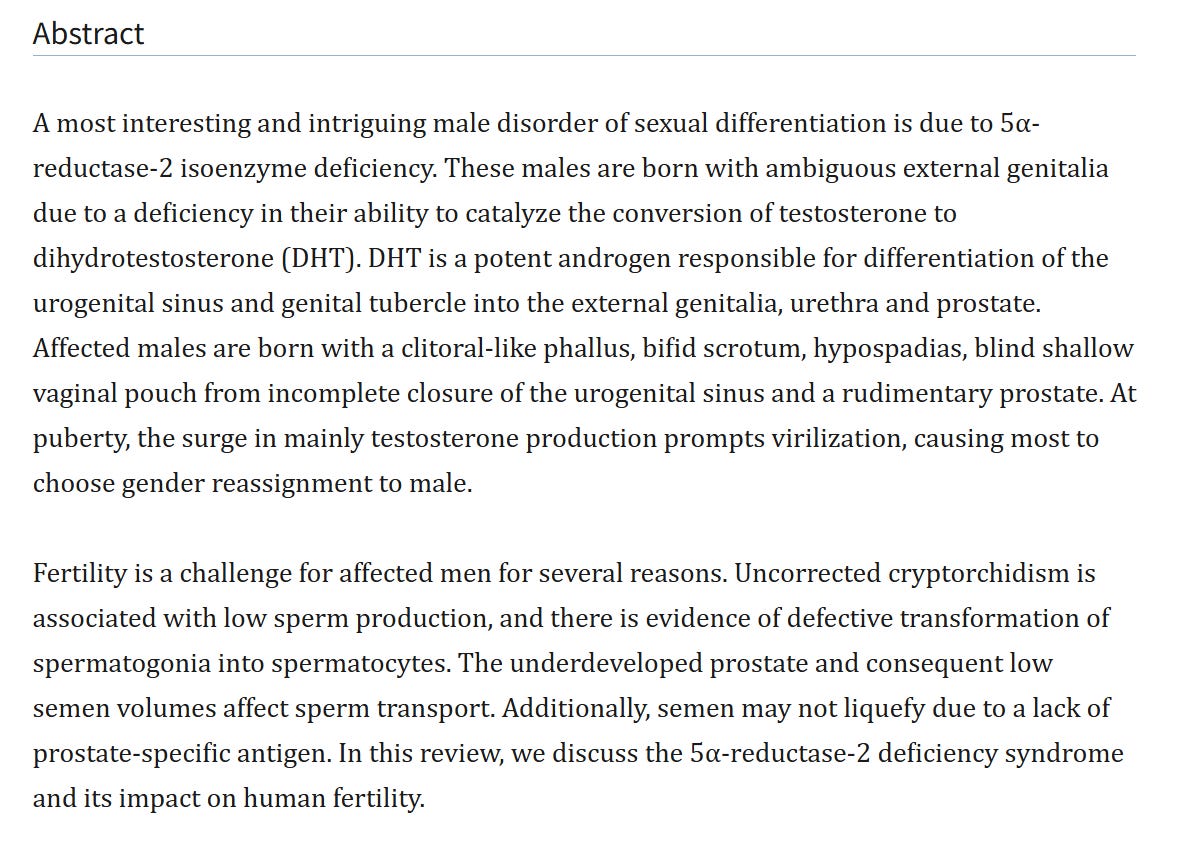 Kang, H., Imperato-McGinley, J., Zhu, Y.-S., & Rosenwaks, Z. (2014). The effect of 5a-reductase-2 deficiency on human fertility. Fertility and Sterility, 101(2), 320–326.